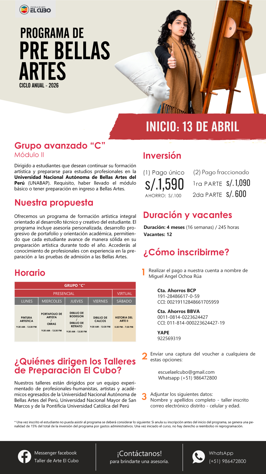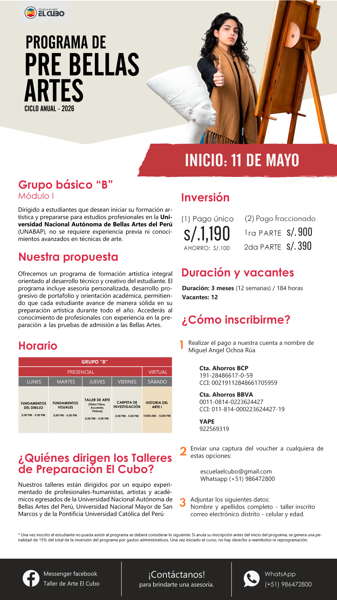 Para inscribirte solicita nuestra cuenta bancaria, envíanos el voucher de pago a nuestro correo escuelaelcubo@gmail.com, o al whatsapp +51 986472800 adjuntando tu nombre completo - DNI - correo - distrito - teléfono y taller inscrito.